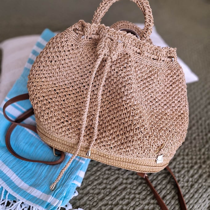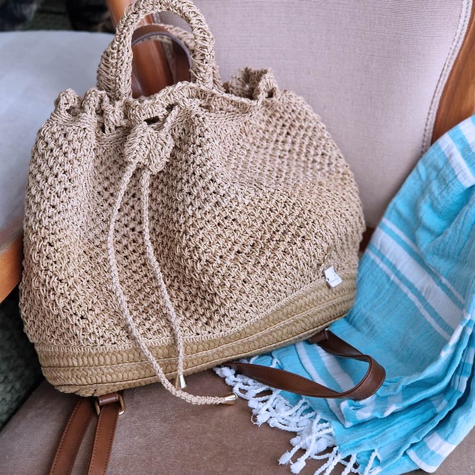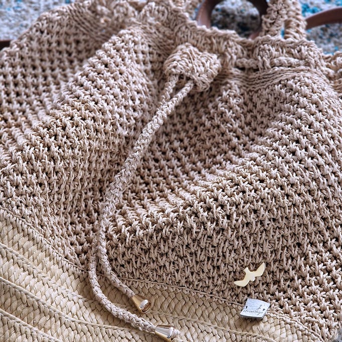 Auch hier: Diese Tasche ist ein Unikat, aus Papiergarn mit Bastboden, diversen Details und fast vegan (ausser das sternerege-Label - ein Auslaufmodell aus Leder). Die Rucksack-Riemen sind aus Kunstleder.