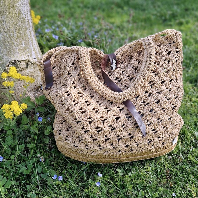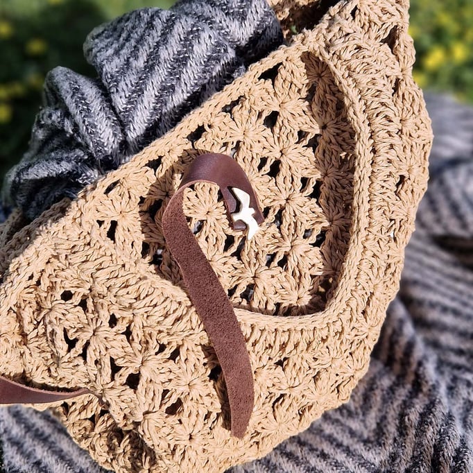 Die Tasche hat ein aufwändiges Häkelmuster, einen Bastboden und Lederriemen, welche wir aus einer alten Schuhfabrik retten konnten. Der Shopper hat Henkel aus Papiergarn plus - und das ist der Wahnsinn! - eine edle Metallkette im Vintage-Style.