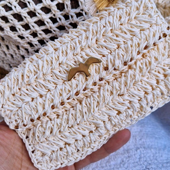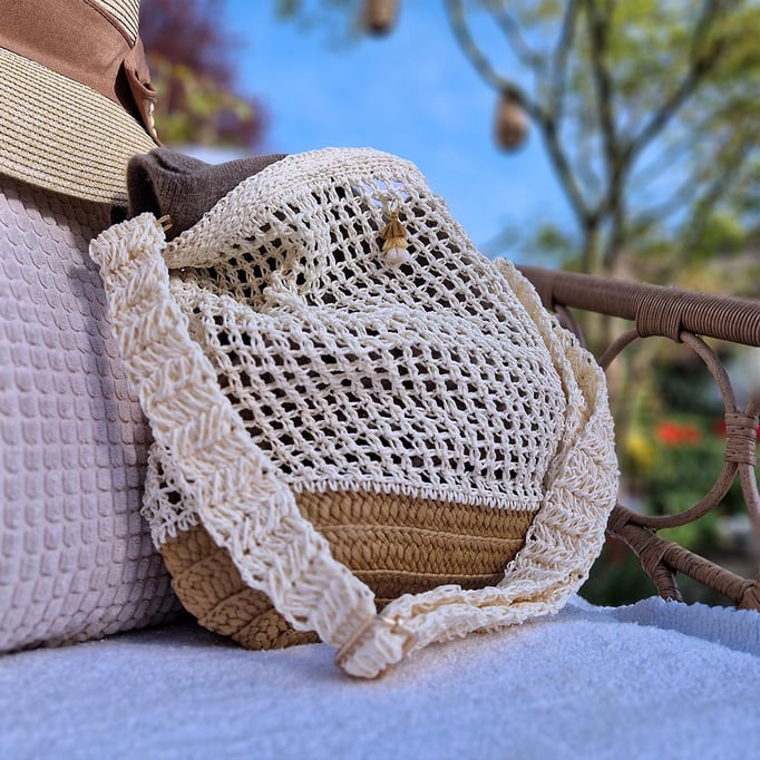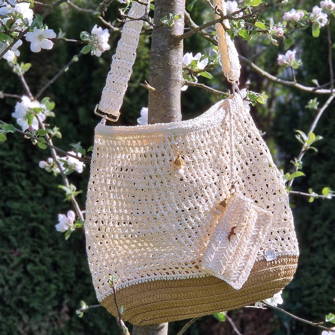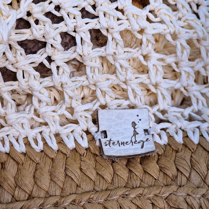 Fast vegan (Ausnahme: Lederlabel - ein Auslaufmodell, was wir in Zukunft nicht mehr einsetzen werden), Tasche aus Papiergarn mit Bastboden. Der Tragegurt ist auch von Hand aus demselben Material hergestellt.